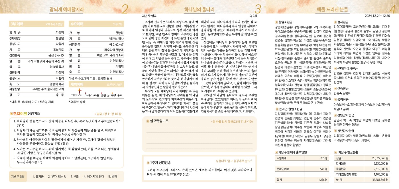 2025년 1월 5일 주보 페이지 정보 작성자 장병조 댓글 0건 조회 987회 작성일 25-01-03 16:00 목록 본문 0105 이전글2025년 1월 12일 주보 25.01.10 다음글2025년 1월 1일 신년예배 순서 24.12.27 댓글 0 댓글목록 등록된 댓글이 없습니다.
