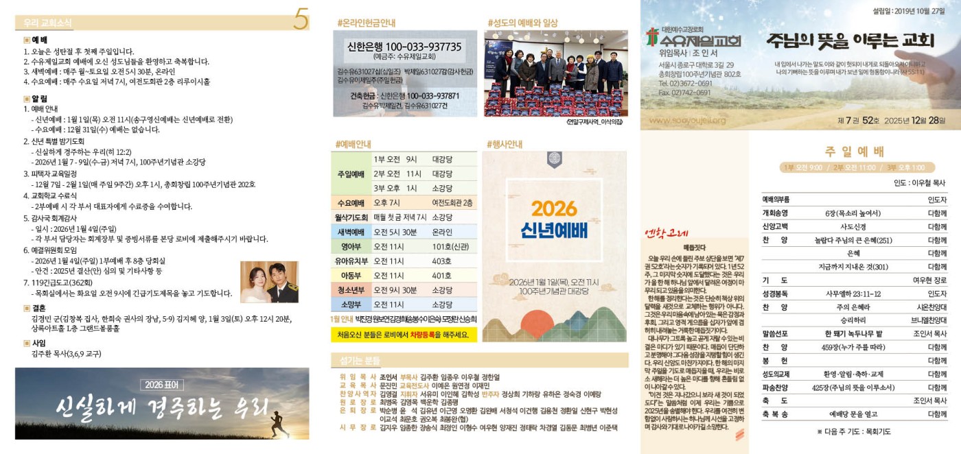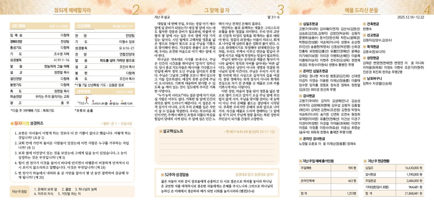 12월 28일 주보 페이지 정보 작성자 임종우목사 댓글 0건 조회 815회 작성일 25-12-24 20:51 목록 본문 12월 28일 주보 이전글1월 1일 신년예배 순서지 25.12.24 다음글12월 25일 성탄예배 순서지 25.12.24 댓글 0 댓글목록 등록된 댓글이 없습니다.
