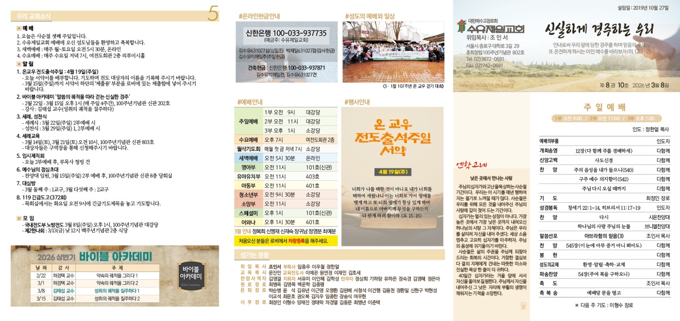 3월 8일 주보 페이지 정보 작성자 이우철 댓글 0건 조회 727회 작성일 26-03-06 15:38 목록 본문 3월 8일 주보 이전글3월 15일 주보 26.03.13 다음글3월 1일 주보 26.02.27 댓글 0 댓글목록 등록된 댓글이 없습니다.
