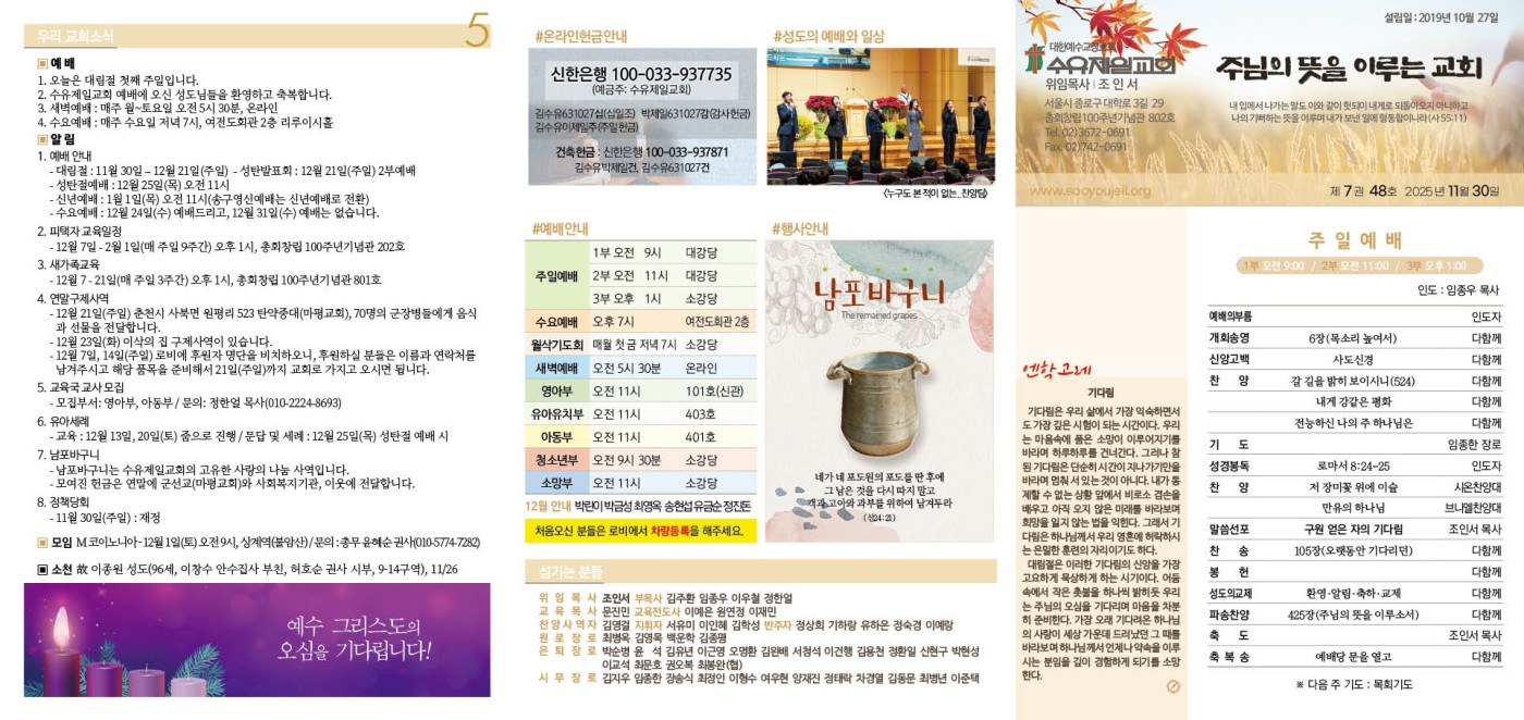 11월 30일 주보 페이지 정보 작성자 임종우목사 댓글 0건 조회 7,055회 작성일 25-11-28 15:21 목록 본문 11월 30일 주보 이전글12월 7일 주보 25.12.05 다음글11월 23일 주보 25.11.21 댓글 0 댓글목록 등록된 댓글이 없습니다.