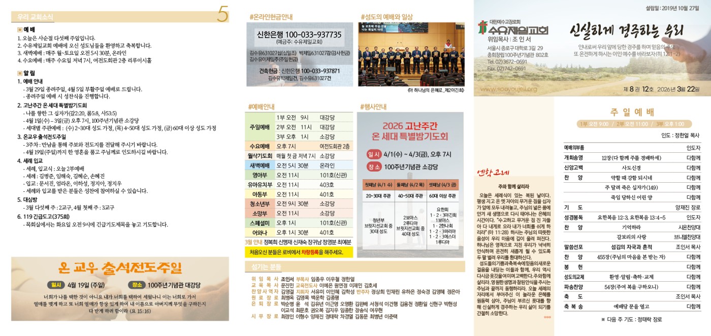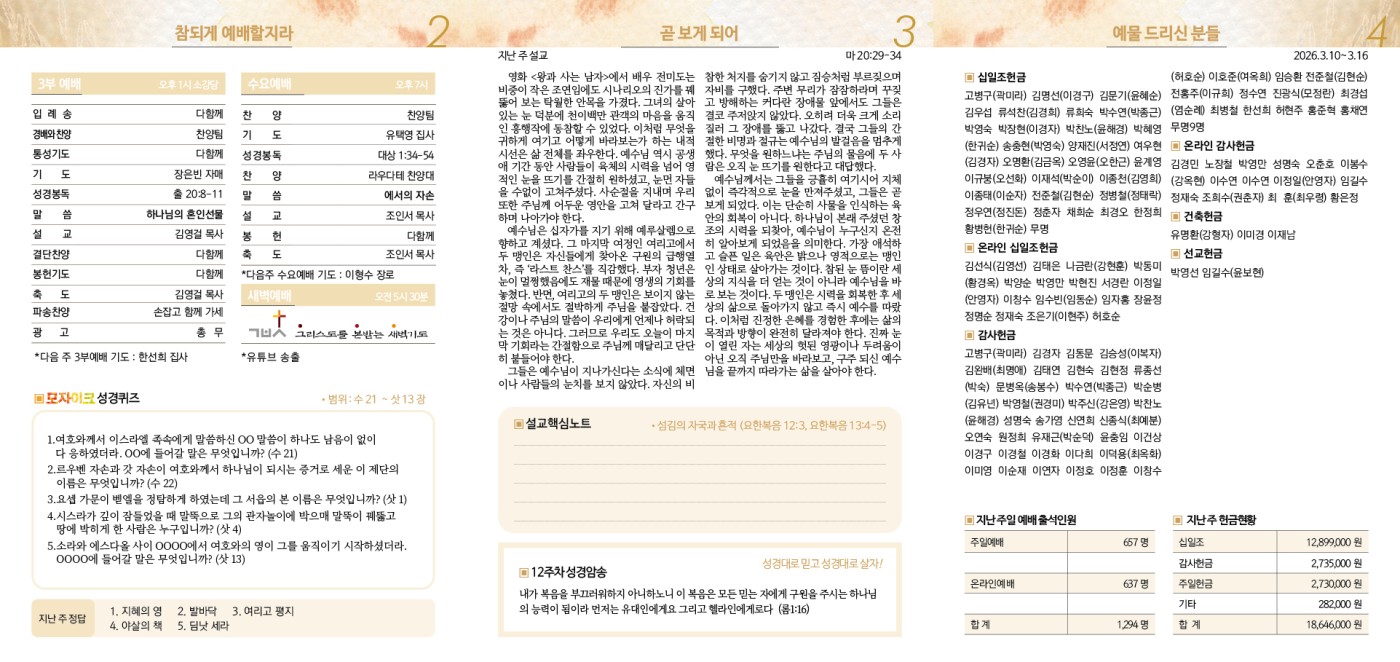 3월 22일 주보 페이지 정보 작성자 이우철 댓글 0건 조회 3,586회 작성일 26-03-20 14:59 목록 본문 3월 22일 주보 이전글3월 29일 주보 26.03.27 다음글3월 15일 주보 26.03.13 댓글 0 댓글목록 등록된 댓글이 없습니다.